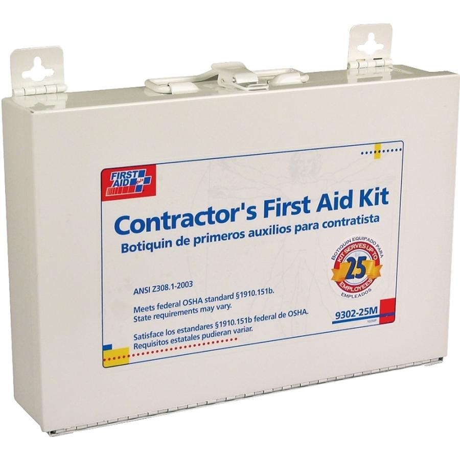 The 9302-25M is a comprehensive, OSHA-compliant first aid kit designed to offer emergency treatment for up to 25 individuals. Containing 179 pieces, including a variety of bandages, antiseptics, and emergency tools, this kit is encased in a durable metal case with a gasket to ensure contents remain secure and sterile. With bilingual labels and a wide array of medical supplies, it’s an essential safety component for any workplace or contracting site.